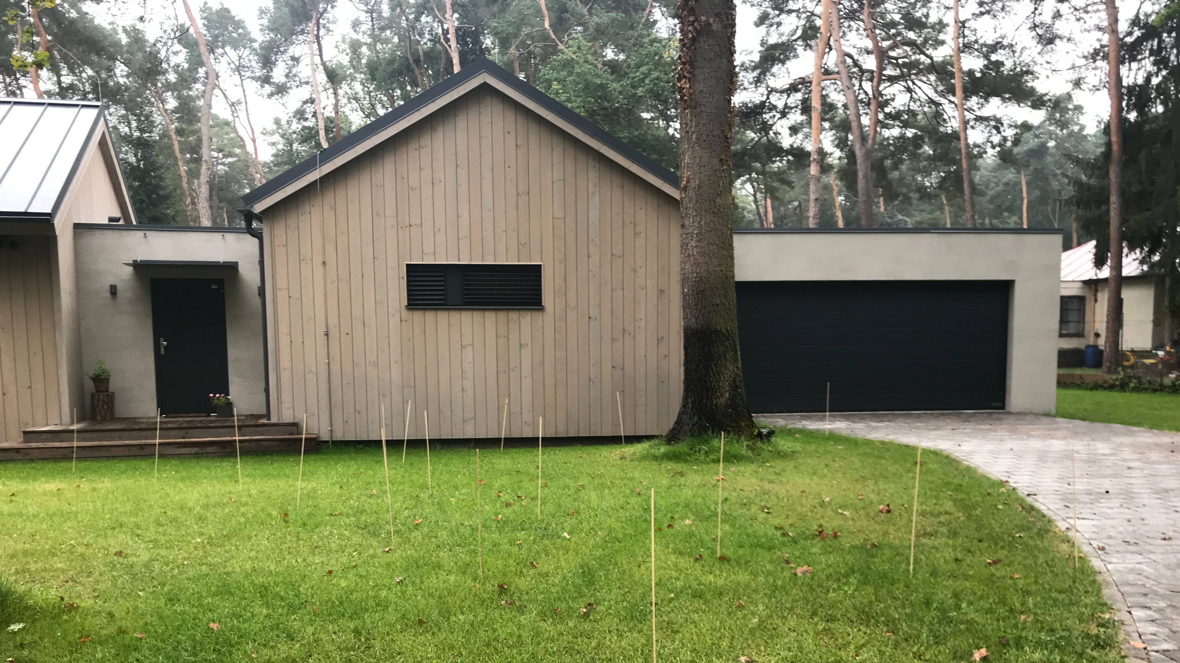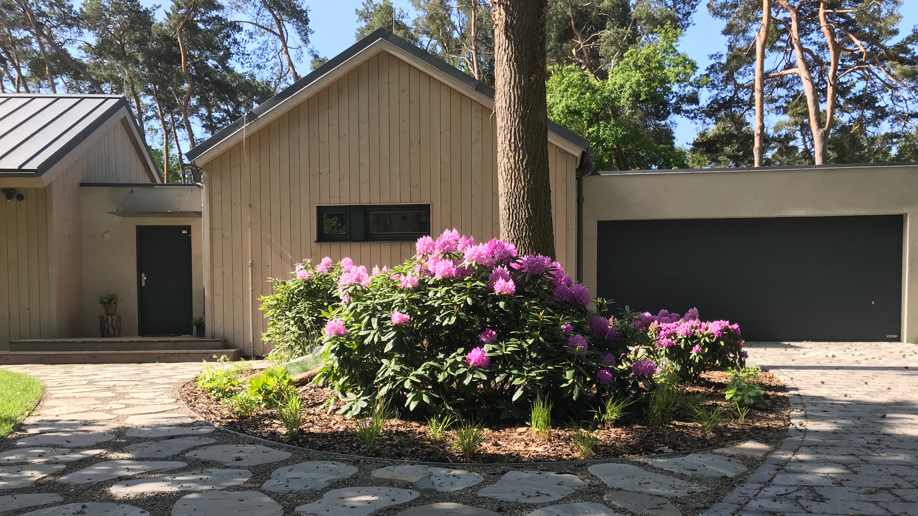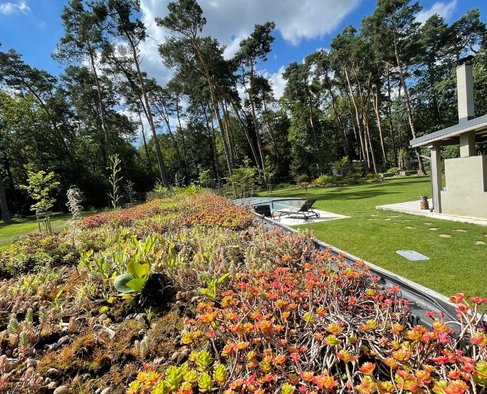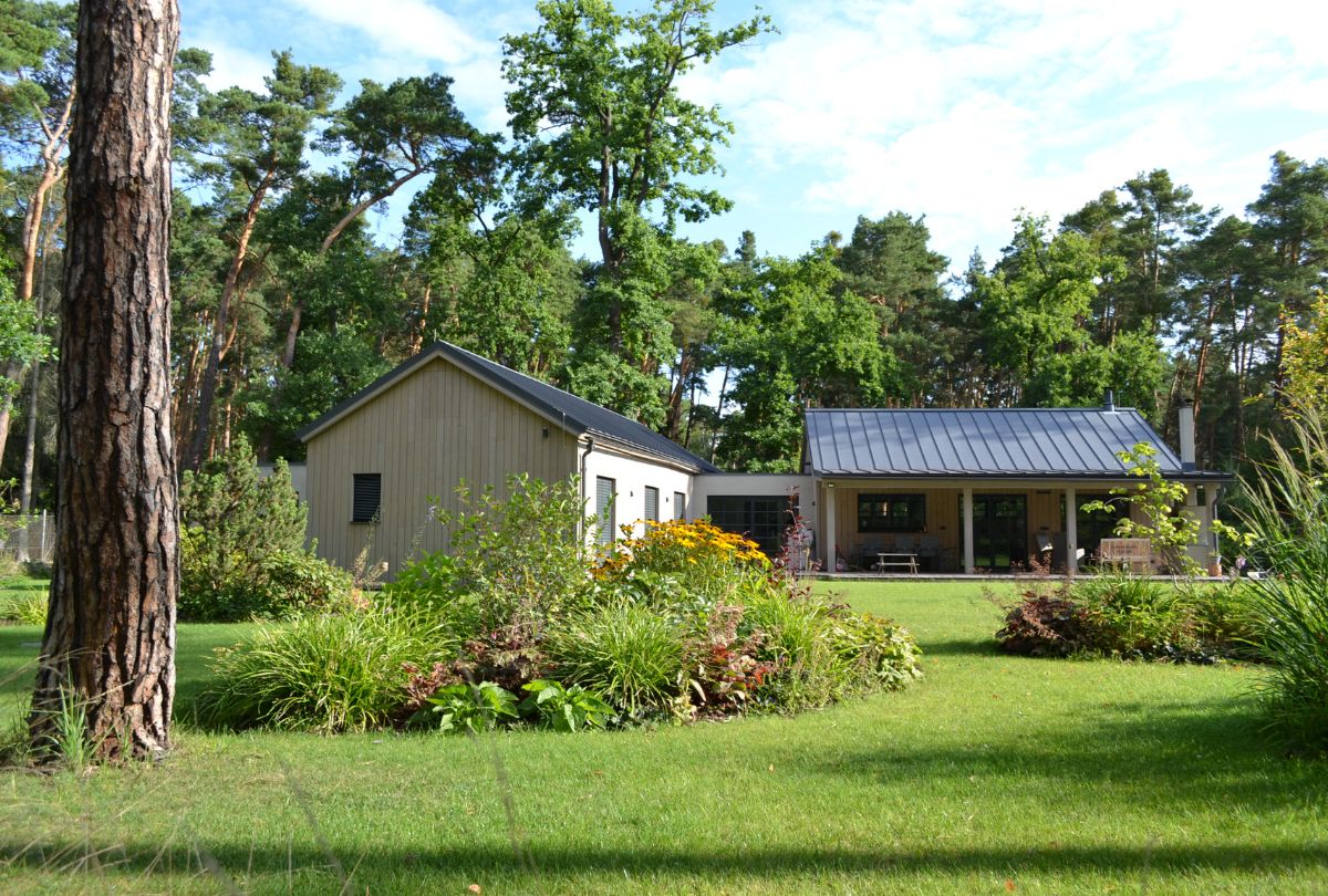 Už od počátku může majitel zahrady spočinout v jejich stínu, aniž by vynaložil velké investice do vzrostlých stromů okrasných školek. Zároveň se však jedná o pozemek s již danou příchutí a vůni, proto je v návrhu zahrady na pozemku tohoto typu potřeba opatrně pracovat s novými ingrediencemi. Zahradou se proto ostrůvkovitě proplétají výsadby trvalek s keři tak, aby stále evokovaly atmosféru lesa. Na lesní charakter navazuje okrasná skalka, která lemuje krytý bazén a zapojuje jej tak do celé lesní zahrady. Vysoký dřevník tvoří přirozenou clonu od sousedního pozemku.