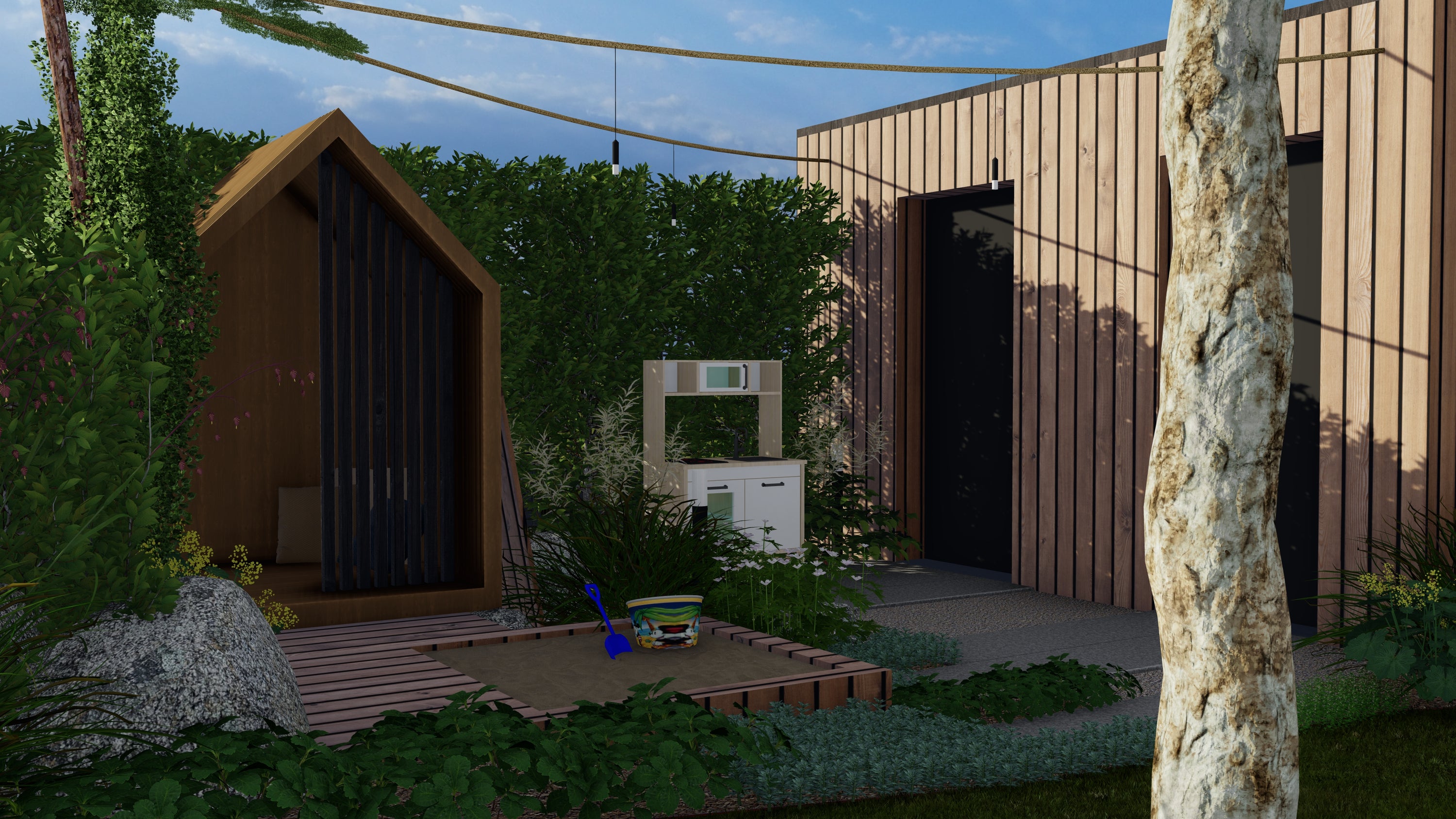 V rohu zahrady se skrývá intimní zákoutí zimní zahrady s krbem, která v chladnějších měsících proměňuje prostor v útulné útočiště. Je propojena s venkovní kuchyní - připravenou hostit jak rodinné snídaně, tak večerní oslavy.