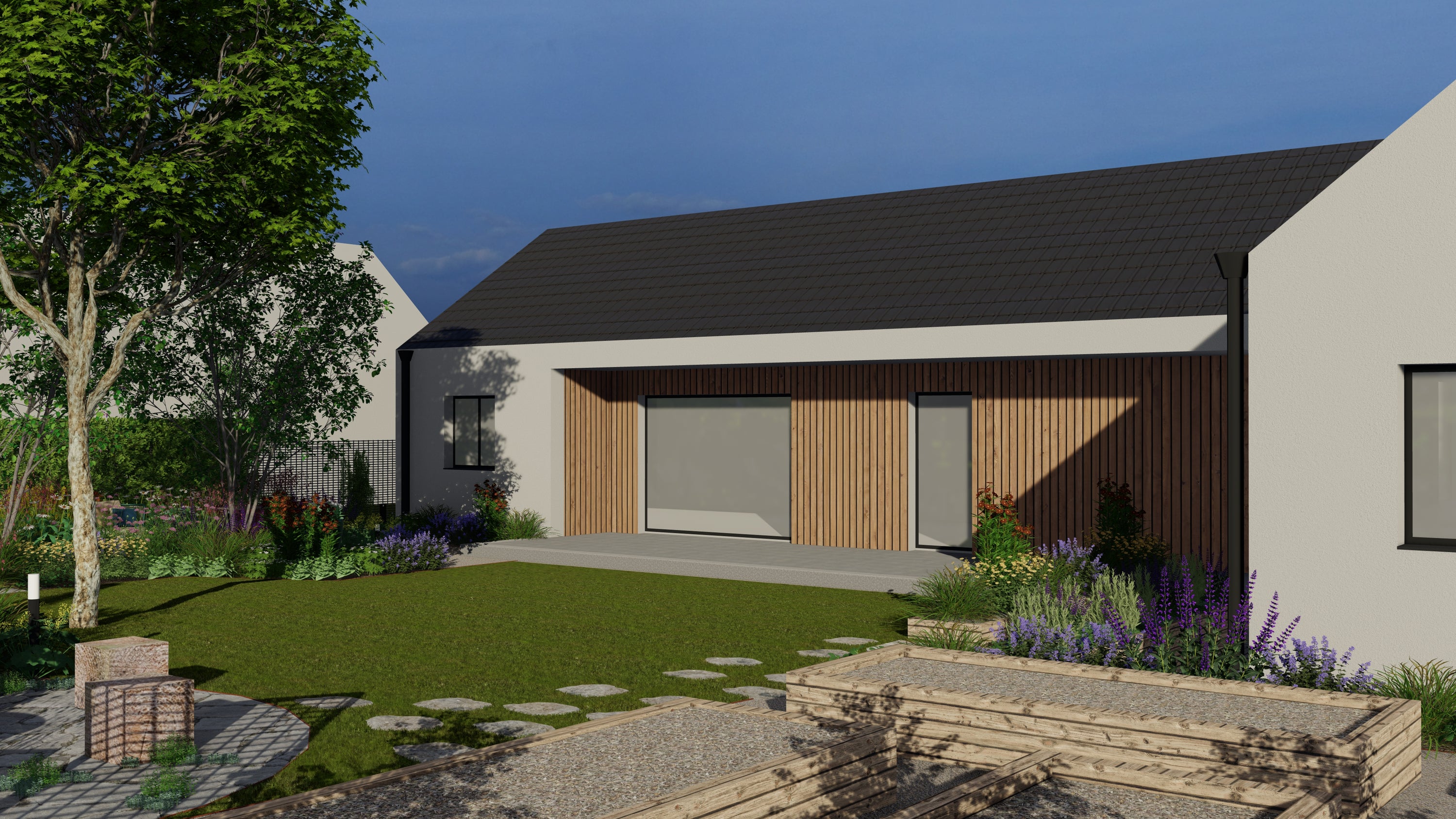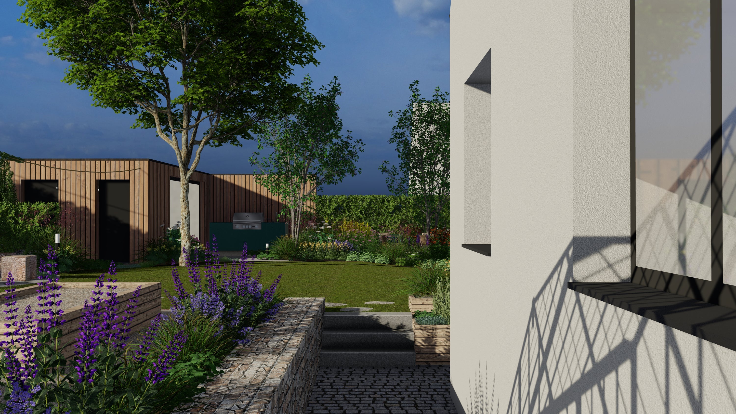 Podél oplocení se záměrně rozprostírá pás divočejší vegetace – jakýsi pruh džungle, jenž geometricky přísné zahradě dodává přírodní nádech a zároveň zajišťuje soukromí. V srdci džungle je umístěné drobné posezení s vodním prvkem, které nabídne klidné zákoutí pro čtení knih či poklidný home office.