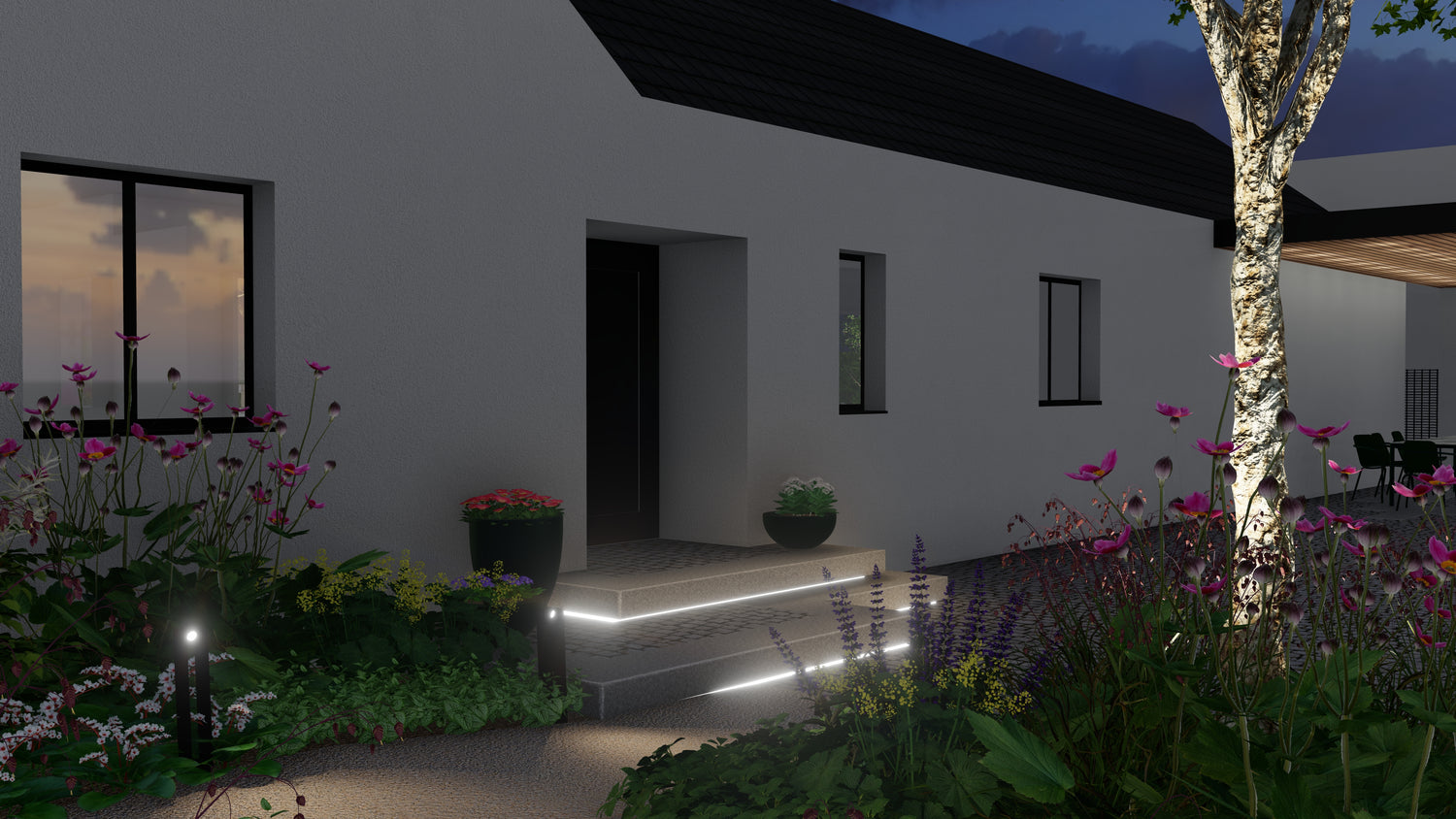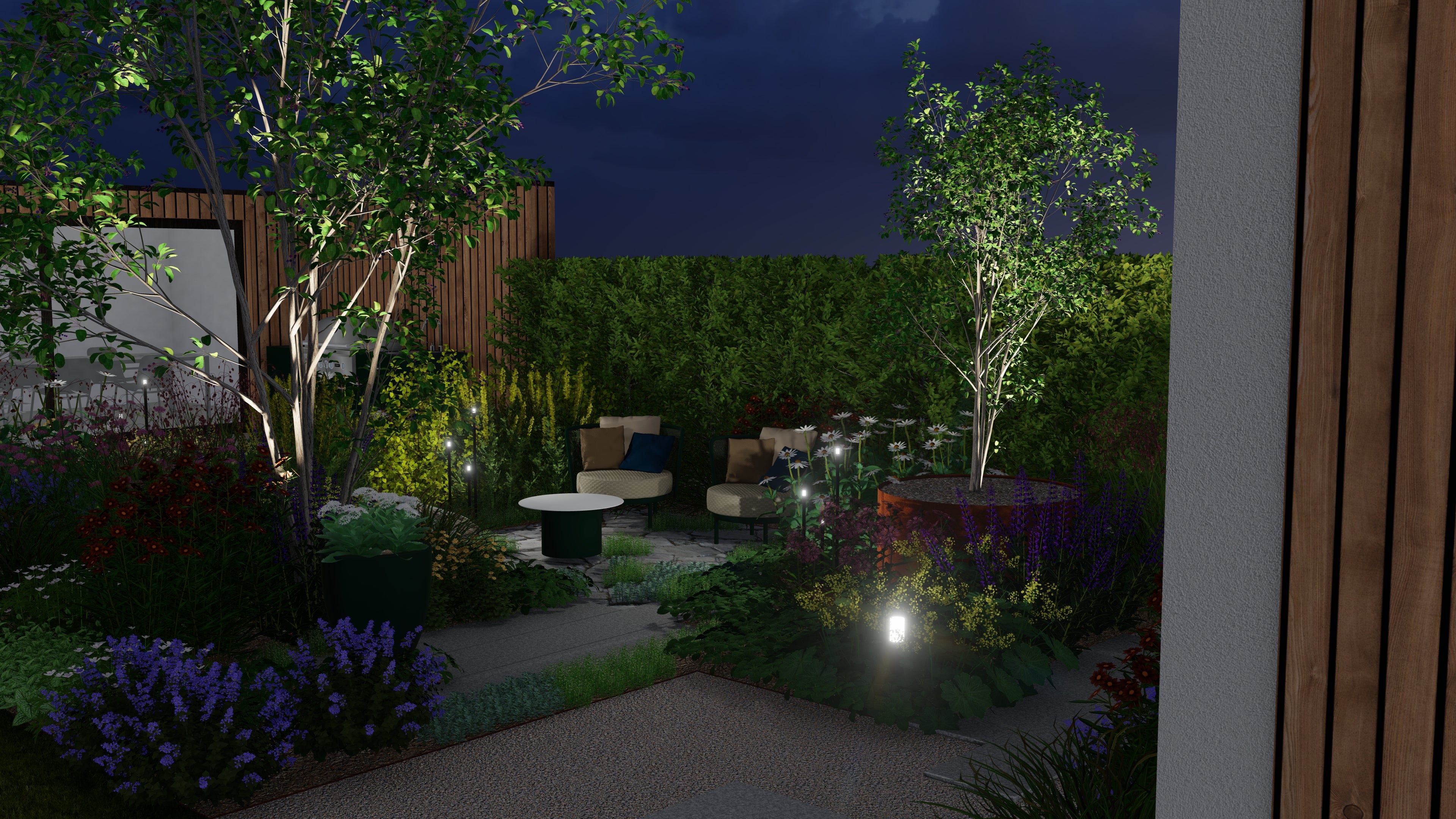Celý prostor je doplněný různými typy venkovních světel. Tak aby zahrada působila nejen přes den, ale i ve večerních hodinách.