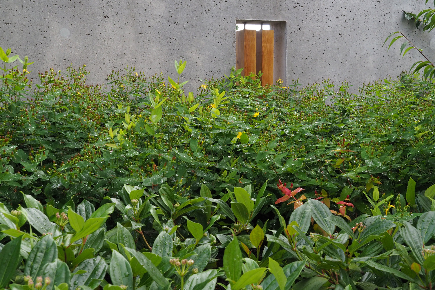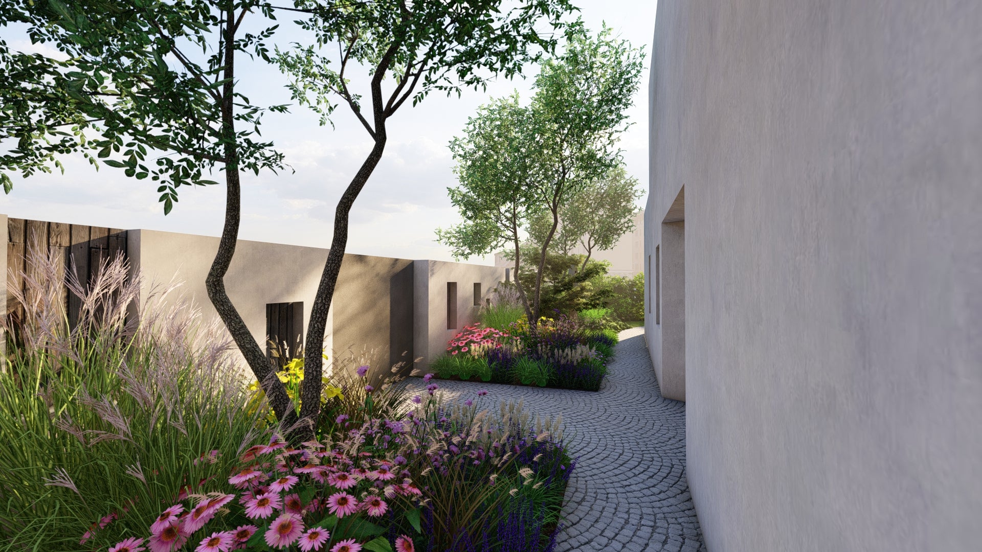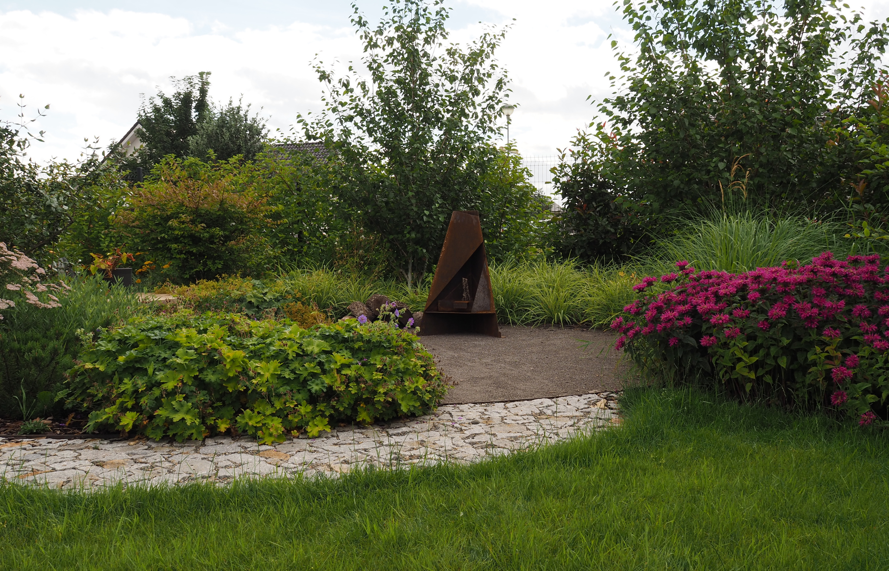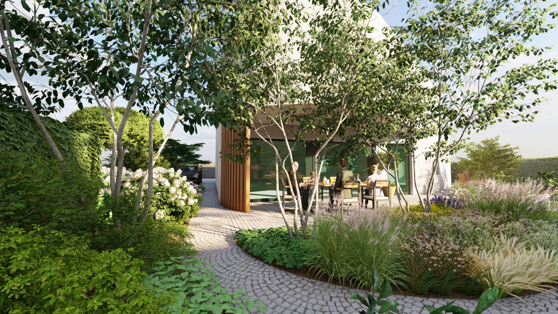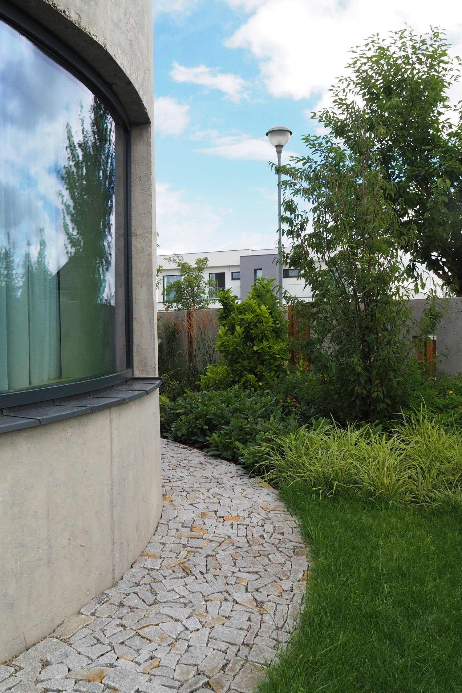 Zahrada u atypického betonového domu spojuje volnočasové a estetické prvky. Je navržena tak, aby byla místem pro setkávání rodiny, známých a přátel.