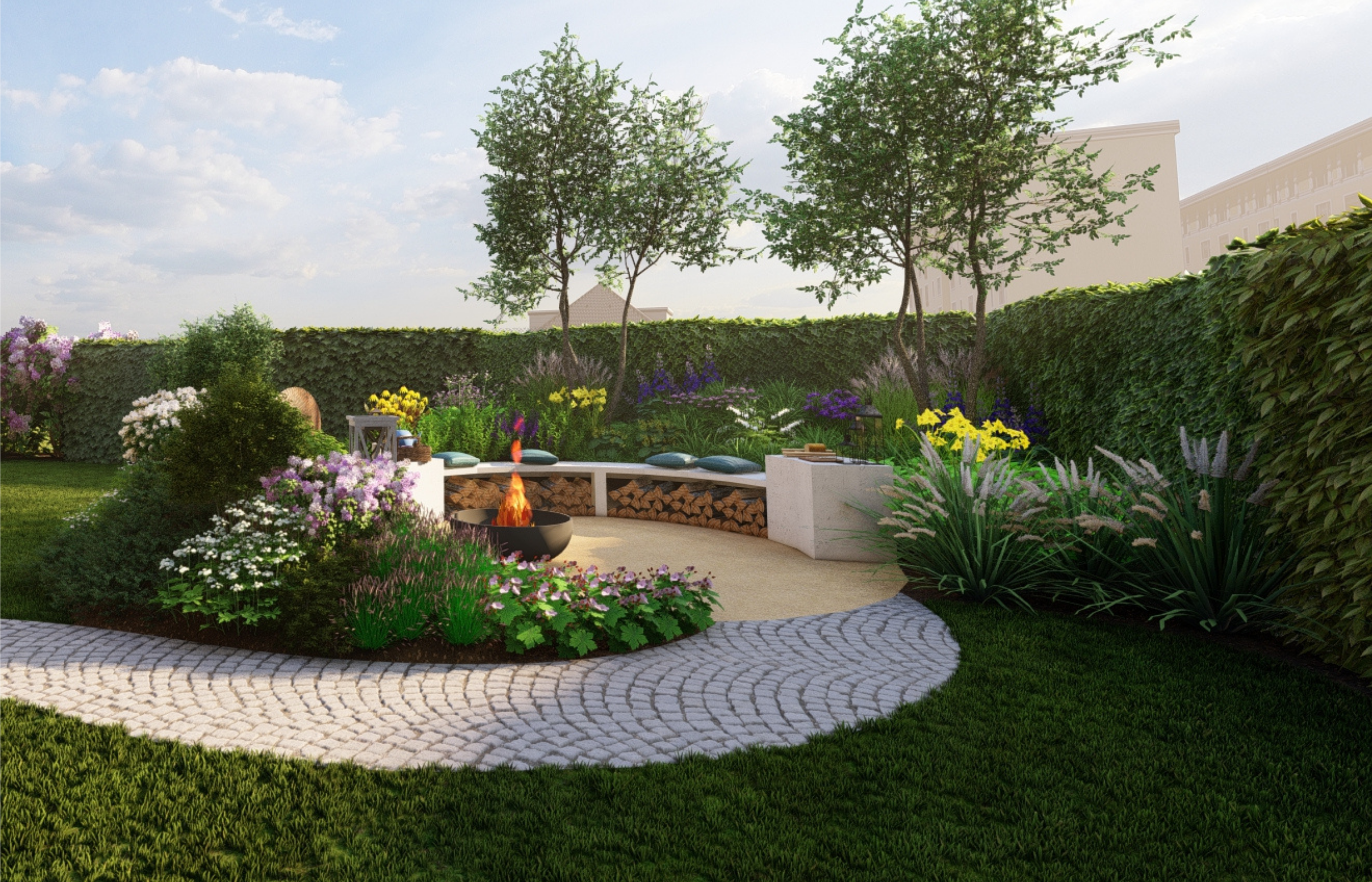 Záhony s pestrobarevnými květinami na předzahrádce zaujmou už při vstupu. Velkou terasu, která láká k venkovnímu stolování, zdobí rostliny v designových květináčích. Odtud vede dlážděná cestička, která se vine až k ohništi s půlkruhovou lavicí.
