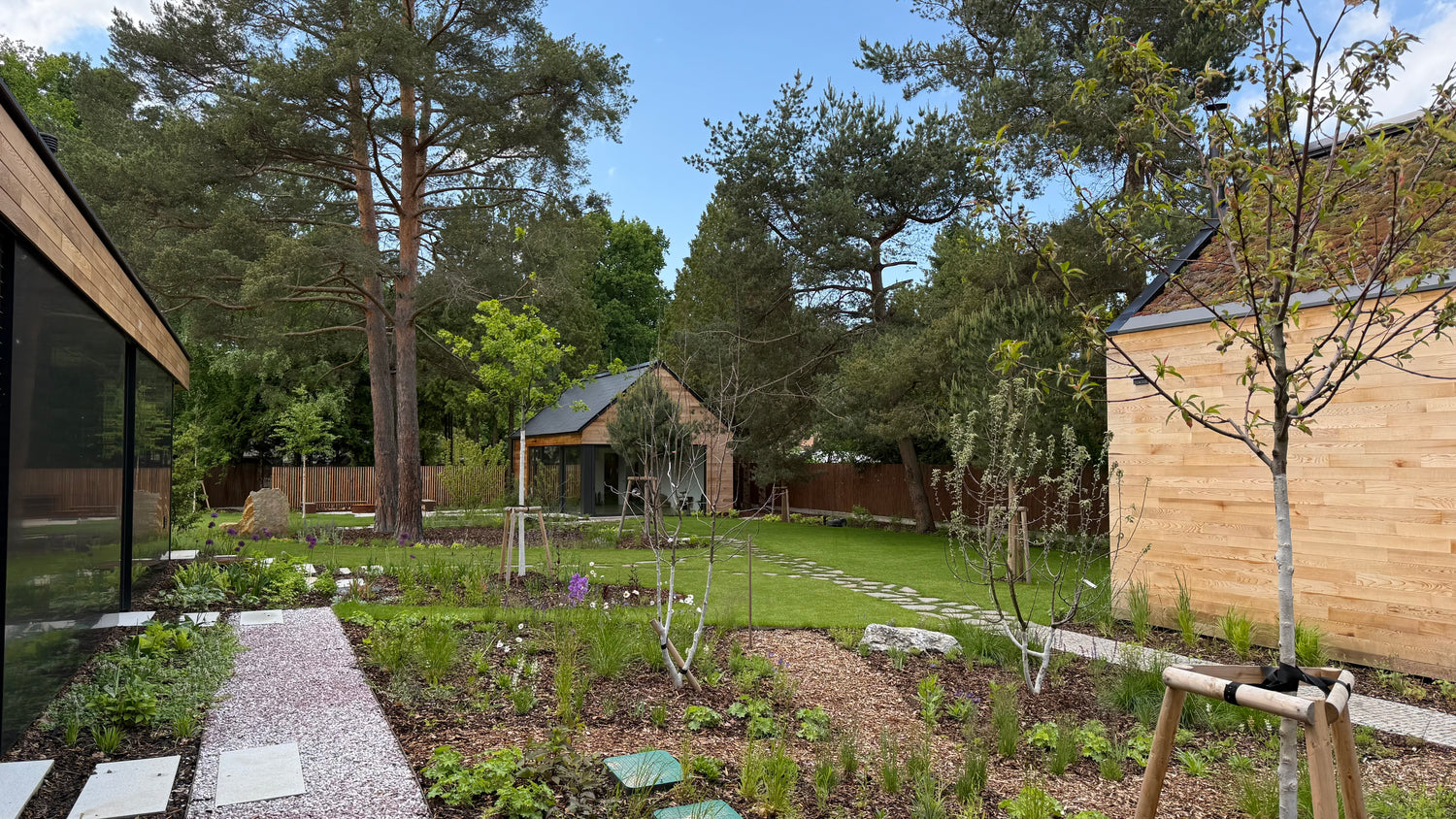 Zahrada s borovicemi - jak už název vypovídá - vyrůstá z velkorysého základu, který tu byl odjakživa – z mohutných, letitých borovic. Tyto vzrostlé stromy se staly definujícím aspektem tohoto pozemku. Jsou určujícím prvkem pro celkové rozložení staveb a kompozice domu a tím i hlavním prvkem této zahrady.