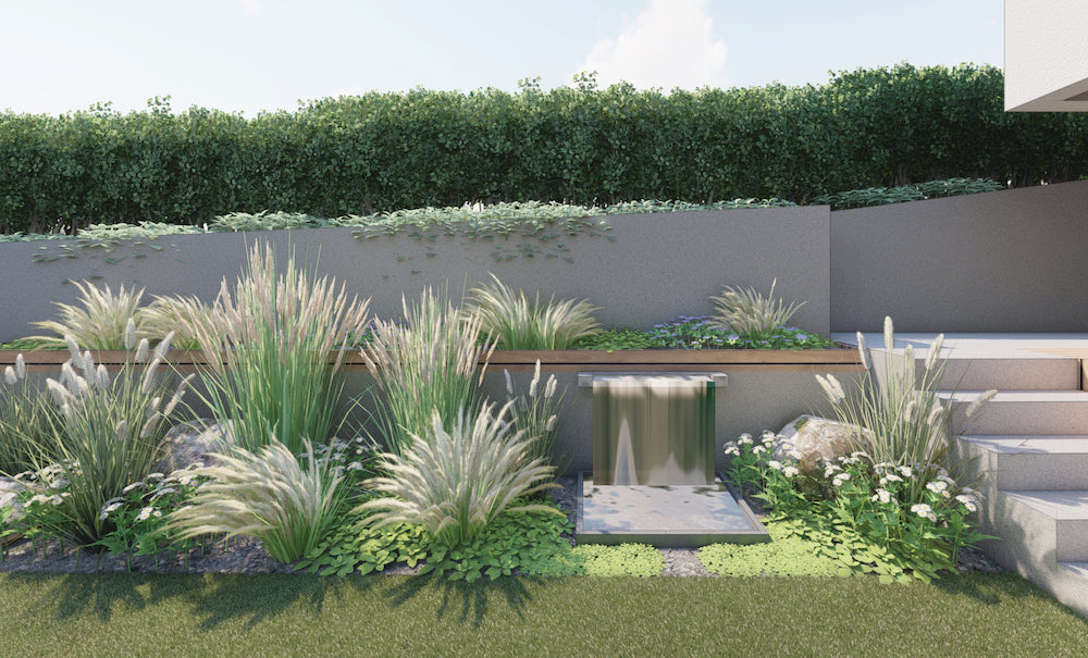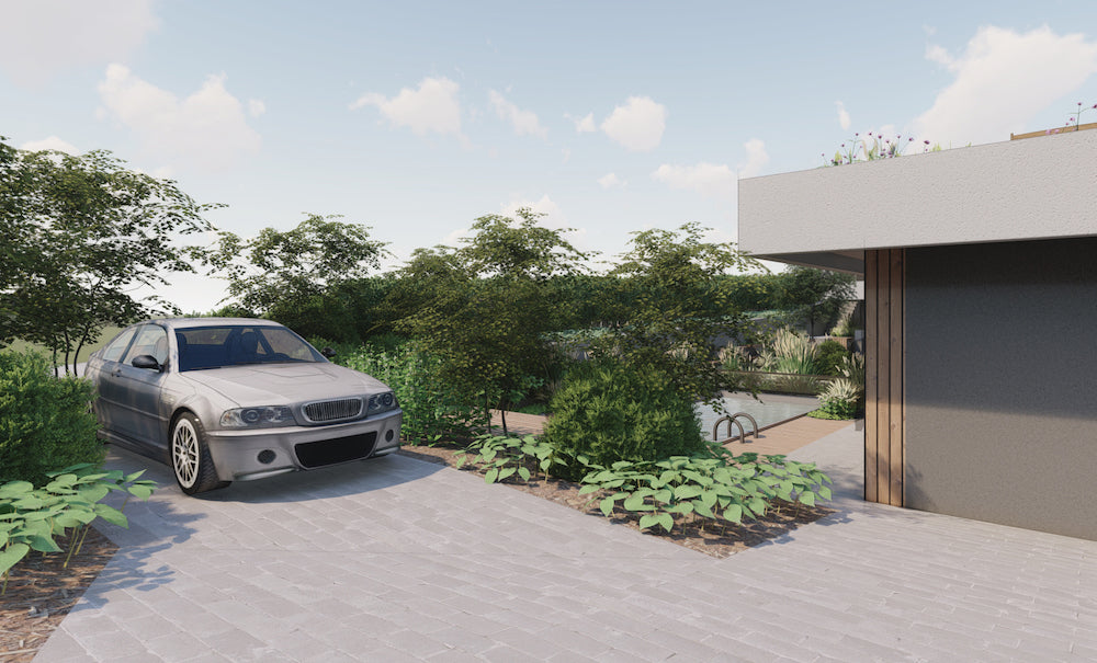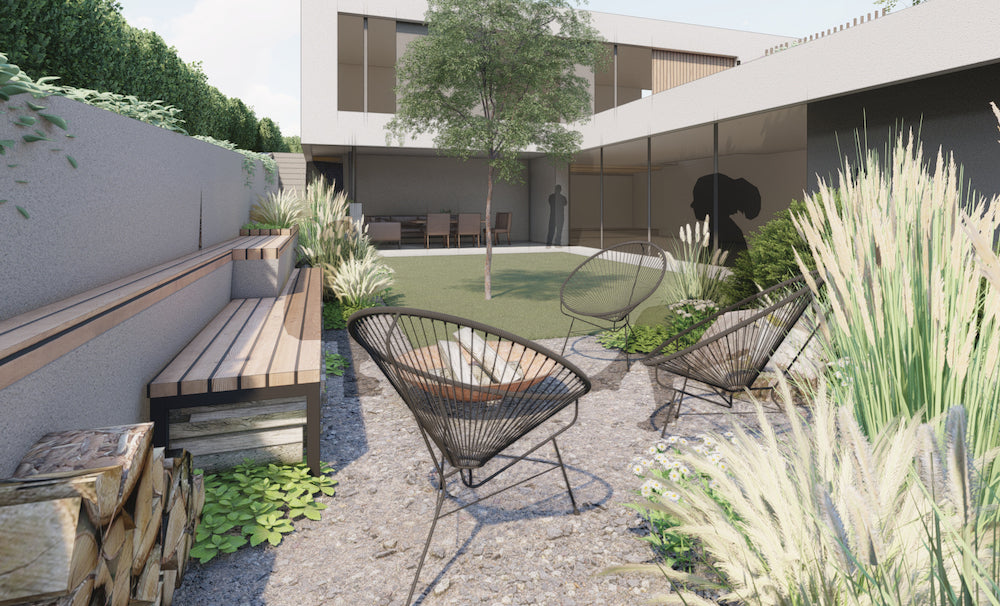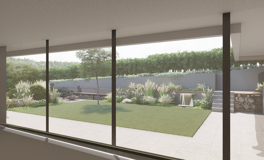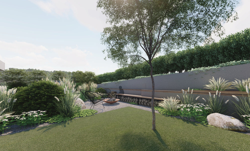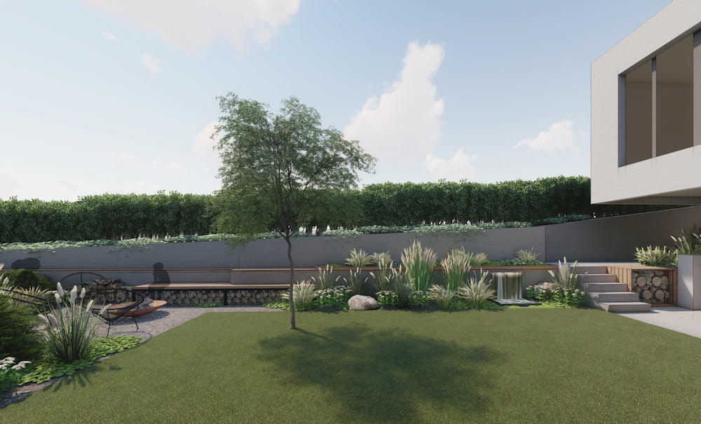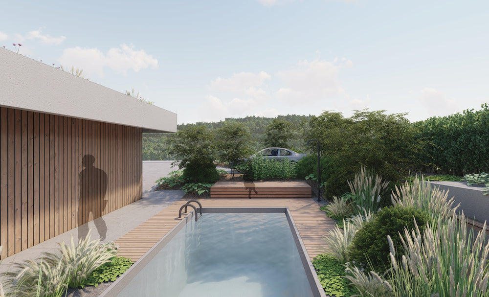 Zahrada jako stvořená pro odpočinek. Bazén lemují okrasné rostliny a stromy, které poskytují stín a soukromí. Místem pro setkávání rodiny i přátel je ohniště s posezením, které je od bazénu oddělené zelení. Vodní prvek ve formě malého vodopádu dodává zahradě další rozměr.